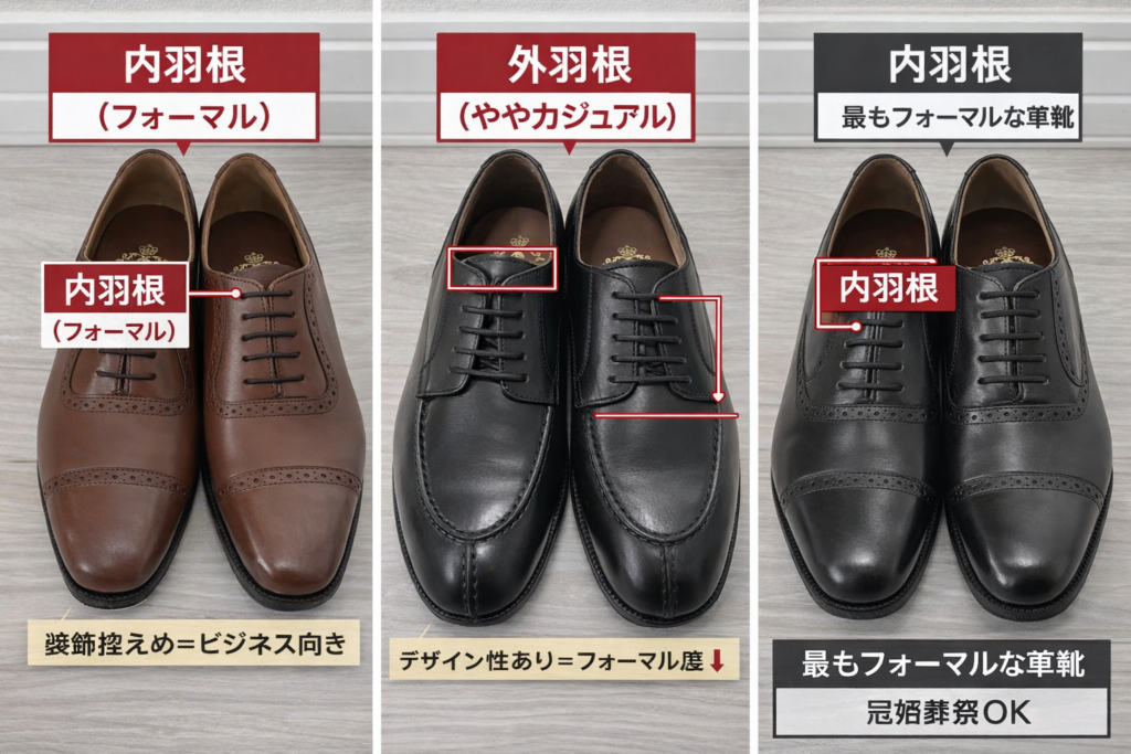 羽(シューレース部分)の構造によるフォーマル度の違い。